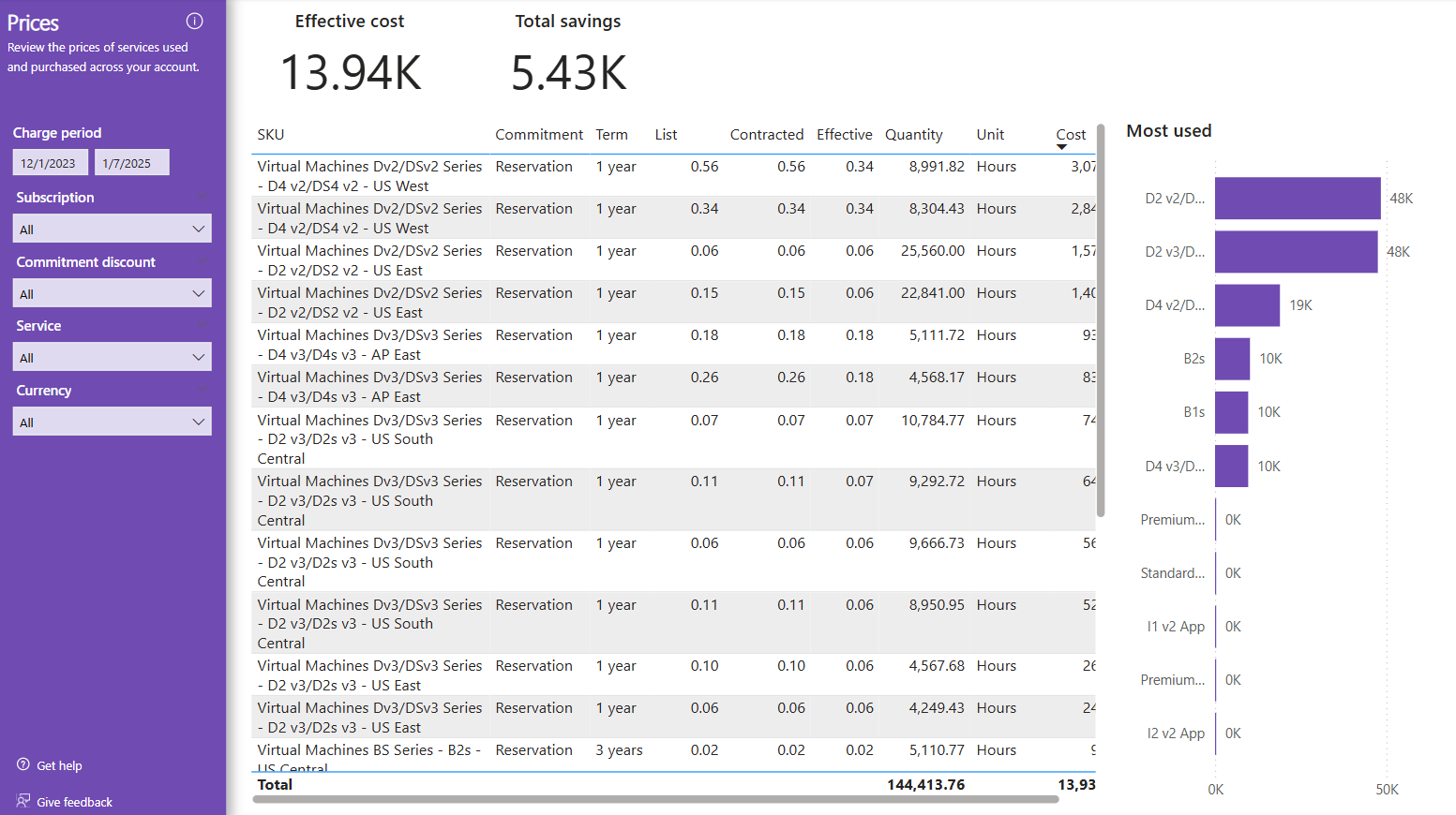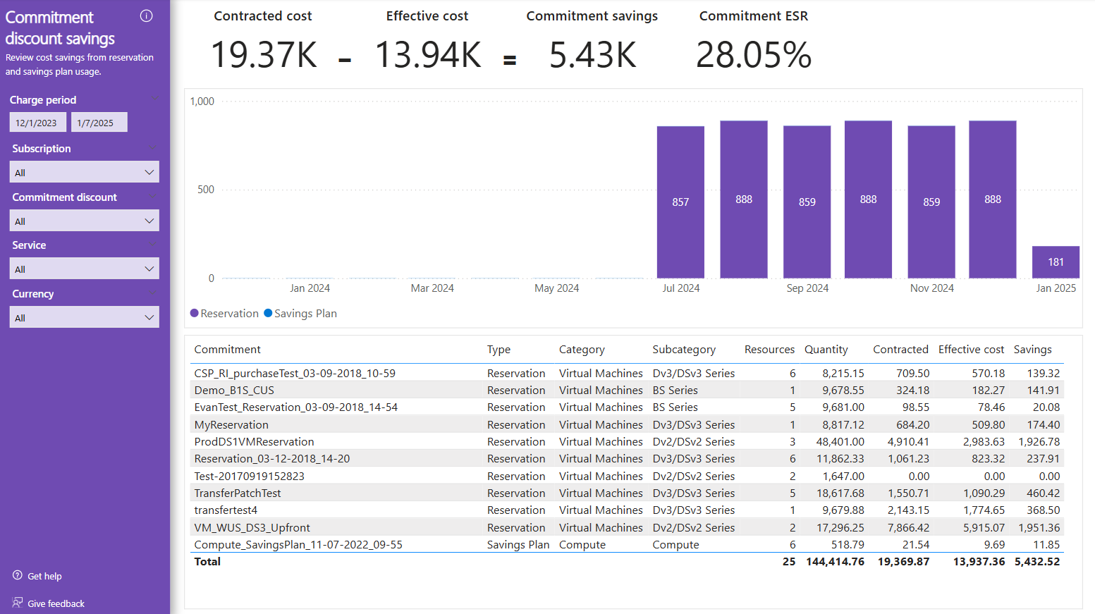 - O custo efetivo mostra o custo efetivo para o período com compras de reserva amortizadas ao longo do prazo de compromisso.