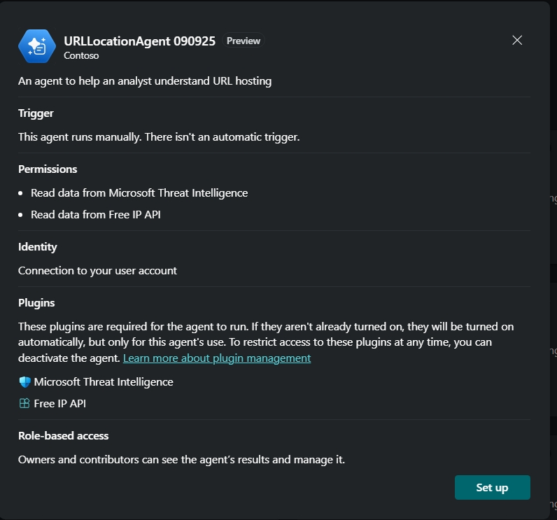 Contoso.SecurityCopilot.Samples-090925.URL_Location_DCA_Agent_Entrypoint-090925. A competência do agente (Format:AGENT) investiga a localização de alojamento do URL.