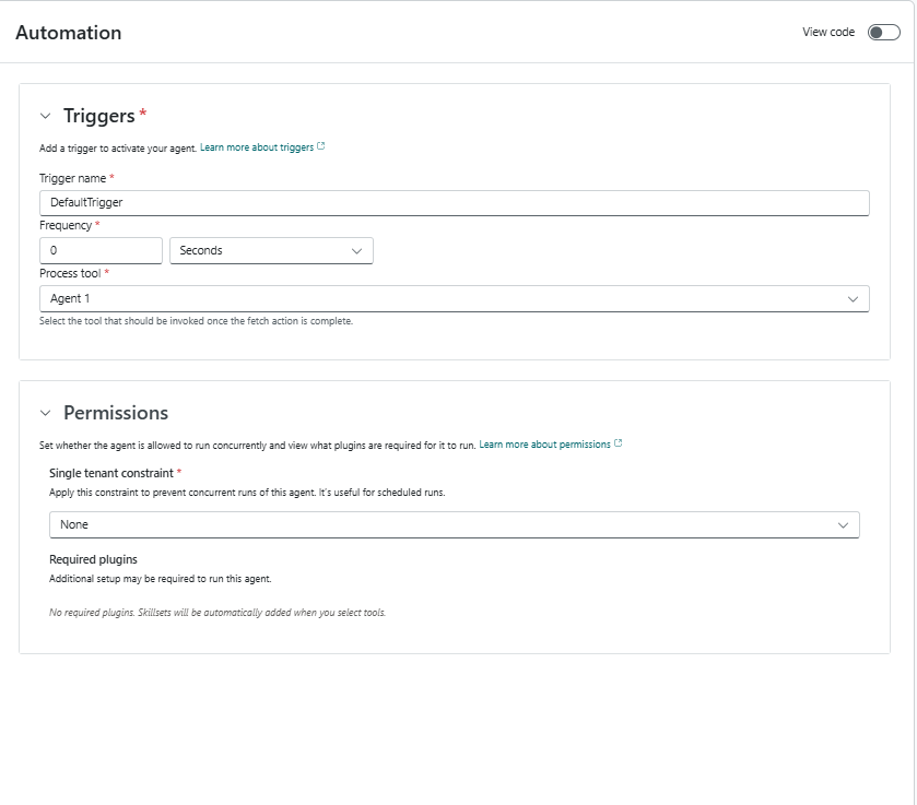Pode alternar Ver código para ver o editor de código a apresentar o código do agente gerado automaticamente num formato YAML.