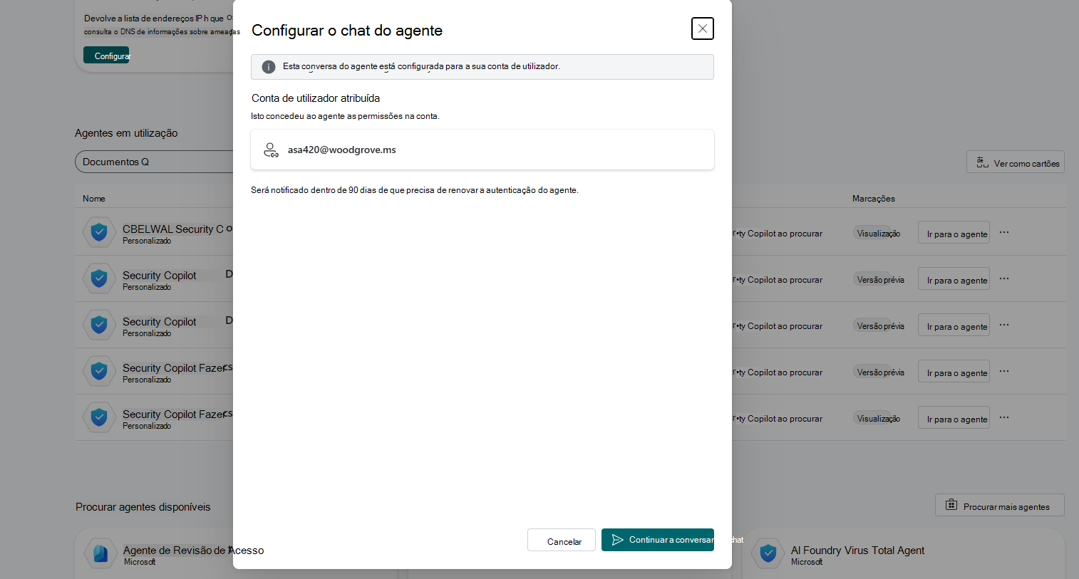Selecione Continuar para conversar para interagir com o agente.