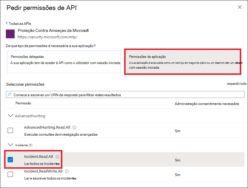 Tem de selecionar as permissões relevantes para o seu cenário. Ler todos os incidentes é apenas um exemplo. Para determinar de que permissão precisa, veja a secção Permissões na API que pretende chamar.
