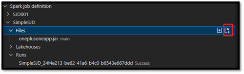 Os processos de pedido e o nome da sua definição de trabalho Spark recém-criada aparecem sob o nó raiz Definição de Trabalho do Spark no VS Code Explorer. No nó de definição de trabalho do Spark, você vê três subnós: