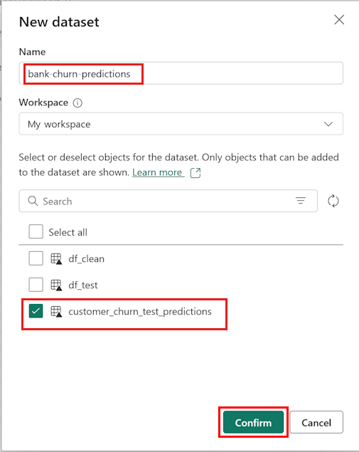 Dê um nome ao modelo semântico - por exemplo, "previsões de rotatividade bancária". Em seguida, selecione o conjunto de dados customer_churn_test_predictions conforme mostrado na captura de tela a seguir: