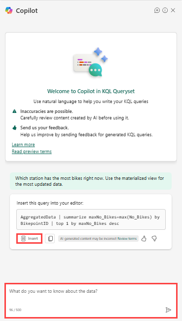 Se você é novo em escrever KQL, você pode fazer uma pergunta em linguagem natural e o Copilot gera a consulta KQL para você.