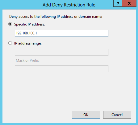 appcmd.exe set config "Default Web Site" -section:system.webServer/security/ipSecurity /+"[ipAddress='192.168.100.1',allowed='False']" /commit:apphost