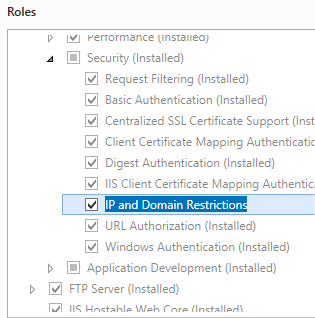 - Na página Funções de Servidor, expanda Servidor Web (IIS), Servidor Web, expanda Segurança e selecione Restrições de IP e Domínio. Clique em Avançar.