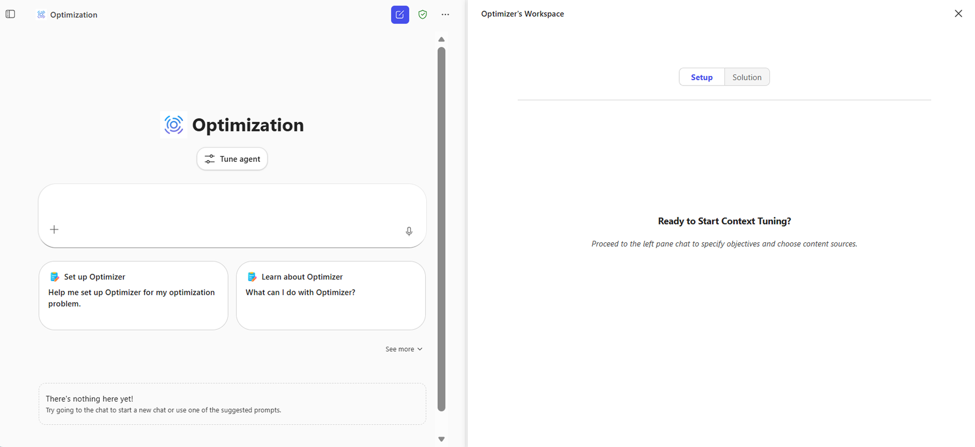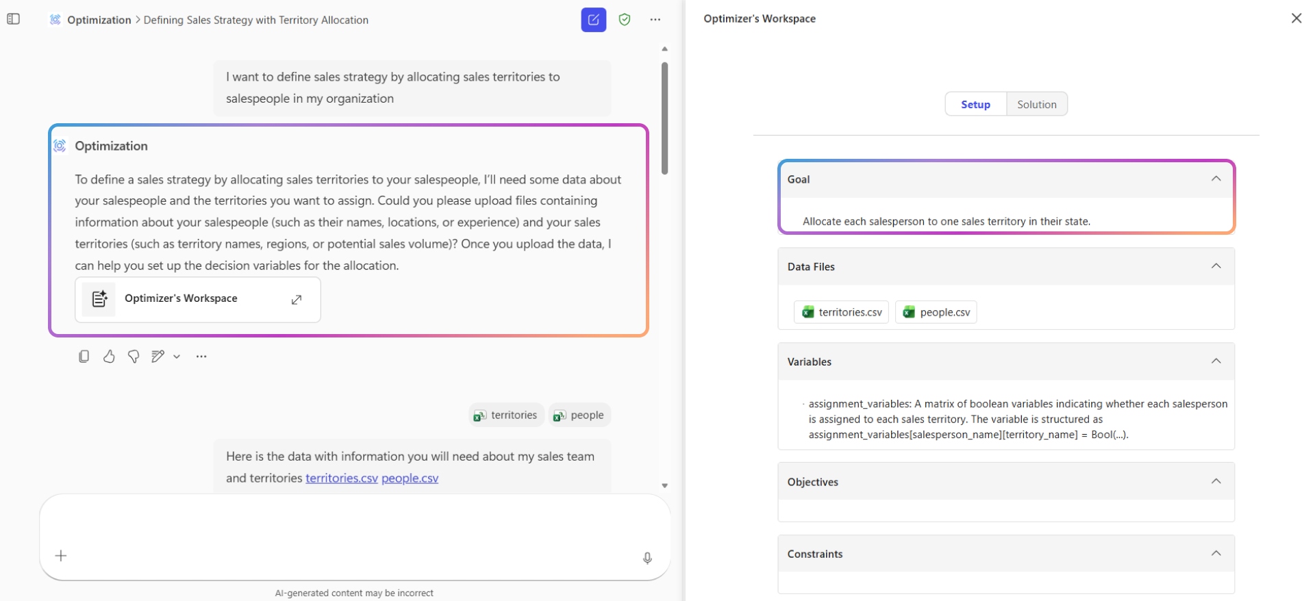 Utilize o chat para descrever o seu objetivo, carregar dados, definir restrições e especificar objetivos. Reveja a configuração no painel lateral à medida que avança.