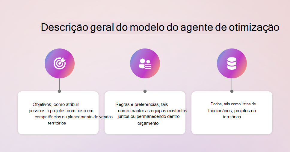 O modelo do Agente de otimização ajuda-o a resolver problemas empresariais baseados em decisões, como a alocação de recursos, agendamento e planeamento, ao calcular soluções ideais com base em objetivos, restrições e dados.
