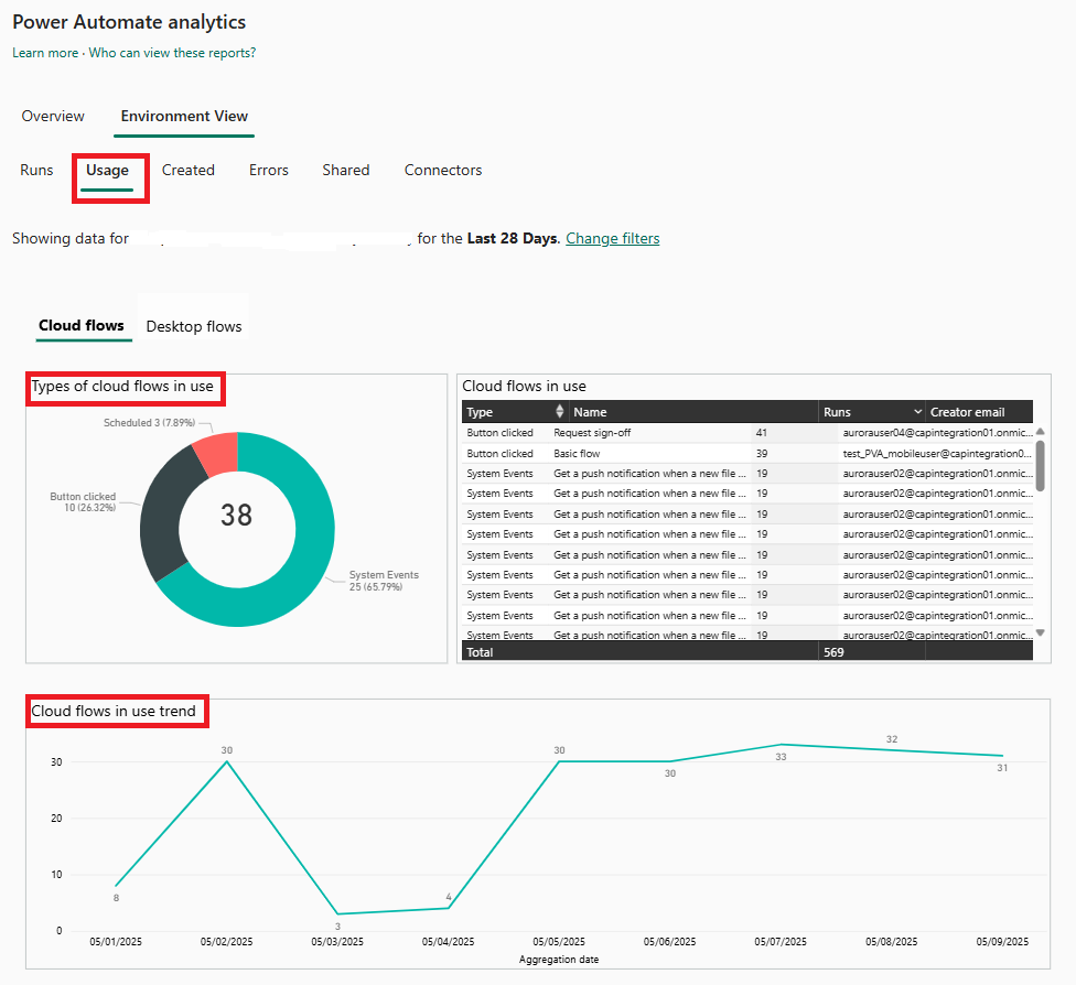 Os seguintes relatórios ao nível do inquilino estão disponíveis para os admins de inquilinos e de ambientes. Os relatórios dentro dos separadores Execuções, Utilização, Criado e Erros fornecem informações sobre Fluxos de cloud e Fluxos de ambiente de trabalho. Por predefinição, é possível ver os relatórios relativos ao último ambiente visualizado.