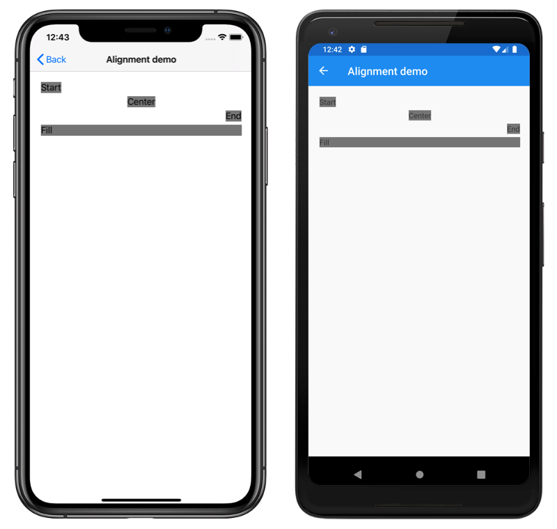 Start, que posiciona oLabelno lado esquerdo doStackLayout.Center, que centraliza oLabelnoStackLayout.End, que posiciona oLabelno lado direito doStackLayout.Fill, que garante que oLabelpreencha a largura doStackLayout.