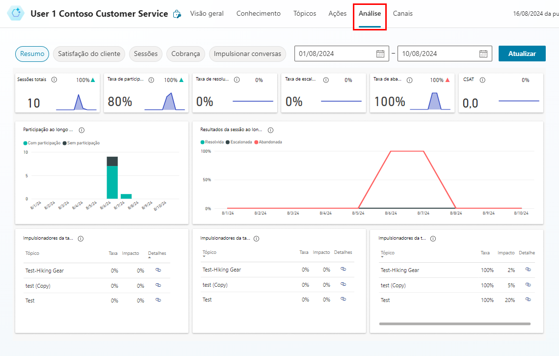 Os visuais adicionais no Resumo incluem gráficos que comparam os resultados da Participação ao longo do tempo e da Sessão ao longo do tempo, bem como tabelas detalhando o impacto e os impulsionadores de taxa de Resolução, Escalonamento e Abandono para cada tópico acionado.