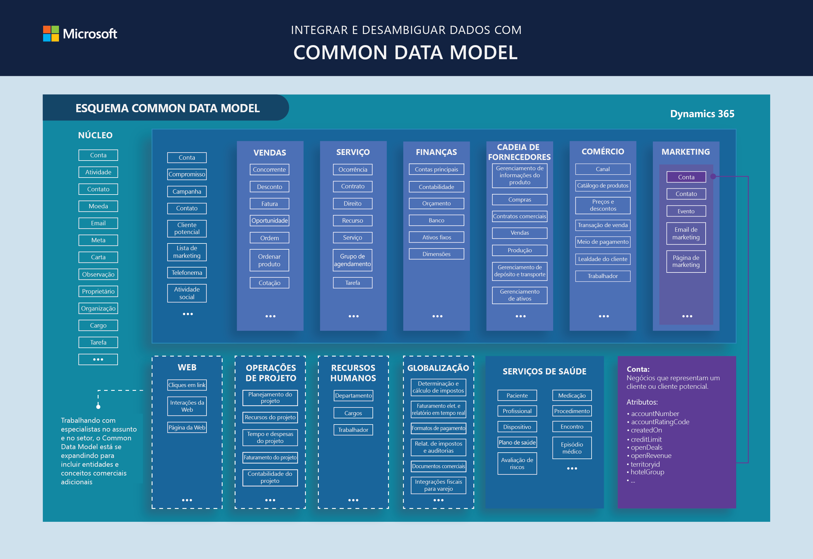 O padrão Common Data Model define uma linguagem comum para entidades de negócios que abrange toda a gama de processos empresariais em vendas, serviços, marketing, operações, finanças, talento e comércio para as entidades cliente, pessoas e produto que são fundamentais para os processos empresariais de uma empresa. O objetivo do Common Data Model é permitir a interoperabilidade de dados e aplicativos, abrangendo vários canais, implementações de serviços e fornecedores. O Common Data Model fornece dados autodescritivos (estrutural e semanticamente), permitindo que os aplicativos leiam e entendam os dados.