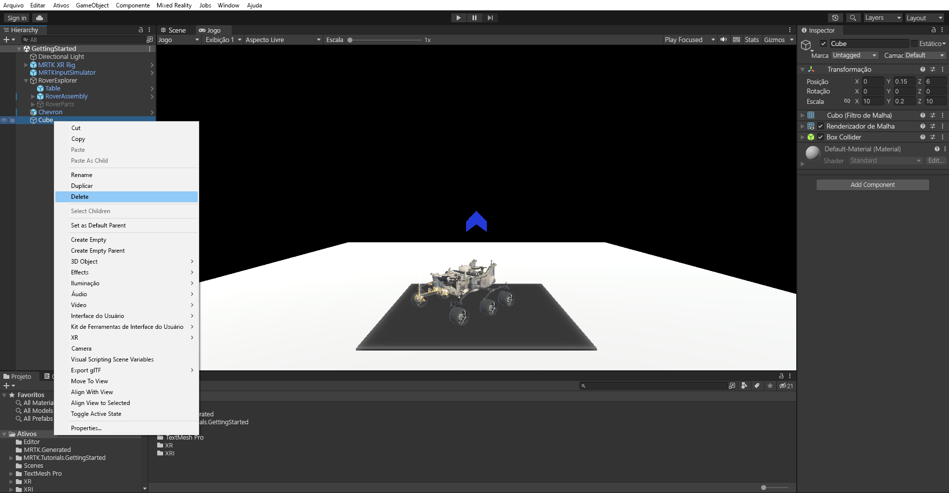 Quando terminar de testar o recurso no modo Jogo , clique com o botão direito do mouse no objeto Cubo e selecione Excluir para removê-lo da cena.