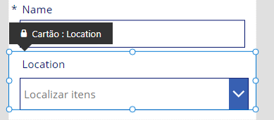 Se já tiver o valor de pesquisa que deseja definir (por exemplo, ao criar um registro de mesa na tela Local), você poderá definir a propriedade DefaultSelectedItems no valor do cartão de dados e, depois, definir a propriedade Visible do campo do formulário como Off. Essa configuração permitirá que o valor padrão seja passado quando a função SubmitForm() for chamada.
