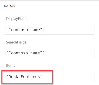 No exemplo da Contoso, você deseja usar os recursos de mesa. Depois de desbloquear o controle, verifique se a propriedade Items mostra 'Recursos de Mesa' como a fonte de dados.