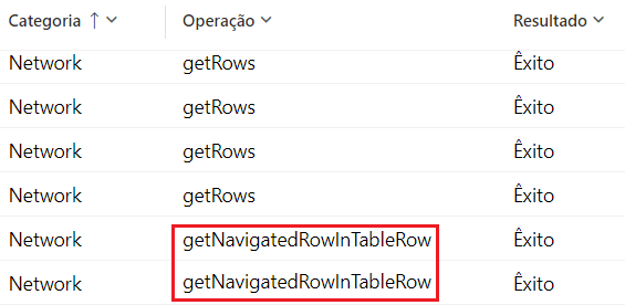 Esteja ciente das implicações de desempenho ao usar essa fórmula, especialmente se você tiver muitos registros, devido à forma como os dados são acessados do Dataverse. A imagem a seguir do Monitor mostra que uma chamada a getRows é concluída para obter a lista de mesas. Para cada mesa, é feita uma chamada a getNavigatedRowInTableRow para recuperar os recursos de mesa.