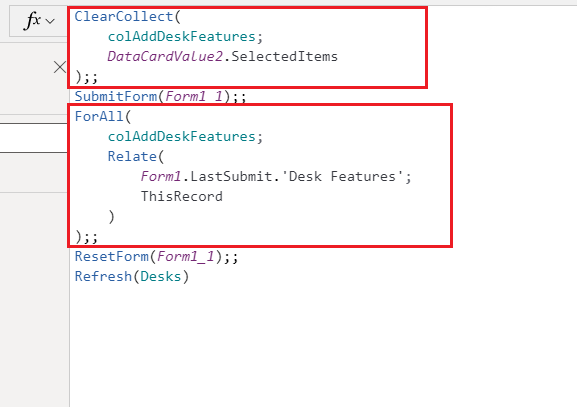 Depois que você desmarcar a propriedade Atualizar, o envio do formulário funcionará. No entanto, os relacionamentos entre as linhas da tabela Mesa e Recurso de Mesa não serão criados. Para estabelecer os relacionamentos, adicione a seguinte lógica à propriedade OnSelect do ícone de verificação usado para enviar o formulário por padrão: