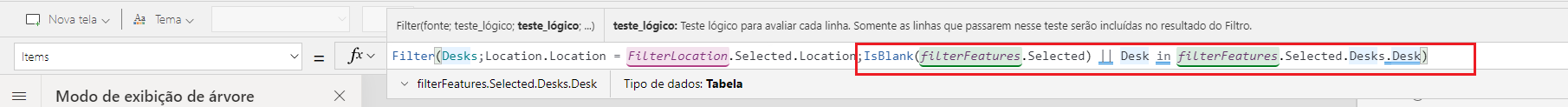Filter(Desks,Location.Location = FilterLocation.Selected.Location,IsBlank(filterFeatures.Selected) || Desk in filterFeatures.Selected.Desks.Desk)Salve as alterações (se necessário).