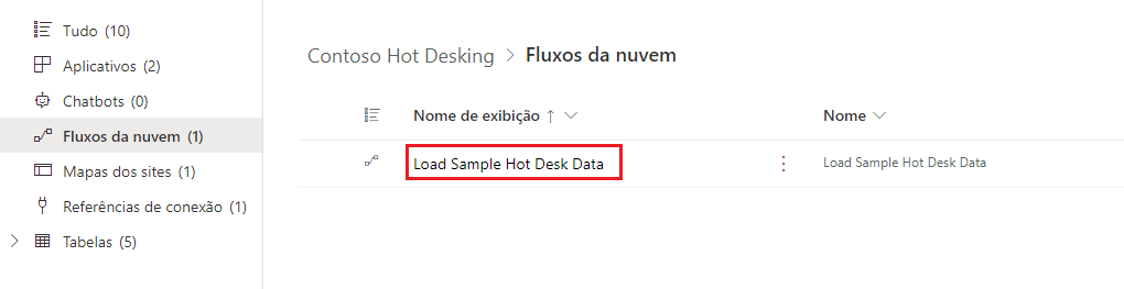 Selecione Fluxos da nuvem e clique para abrir o fluxo Load Sample Hot Desk Data.