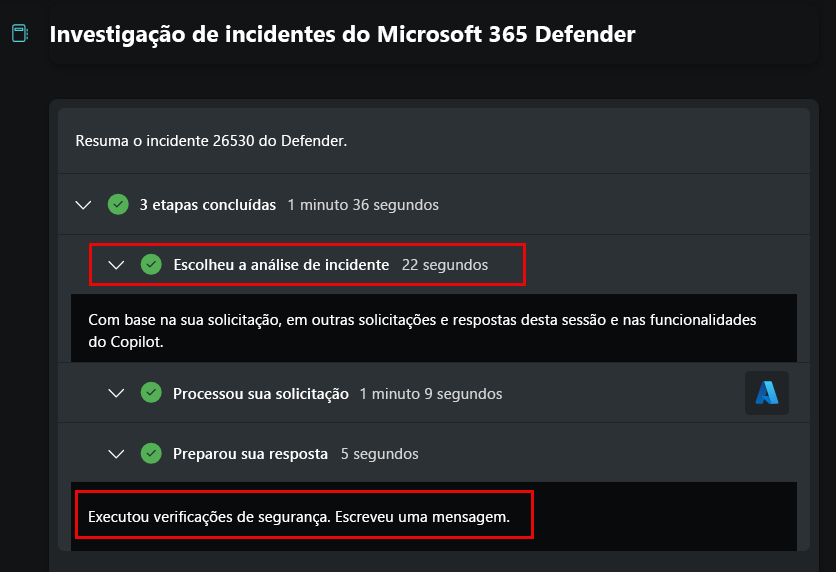 Durante esse processo, o Copilot gera um log de processo que é visível para o usuário. O usuário pode ver qual recurso é usado para gerar a resposta. Isso é importante porque permite que o usuário determine se a resposta foi gerada a partir de uma fonte confiável. Na captura de tela a seguir, o log de processo mostra que o Copilot escolheu o recurso de Análise de Incidentes. O registro do processo também mostra que a saída final passou por verificações de segurança, o que faz parte do compromisso da Microsoft com a IA responsável.
