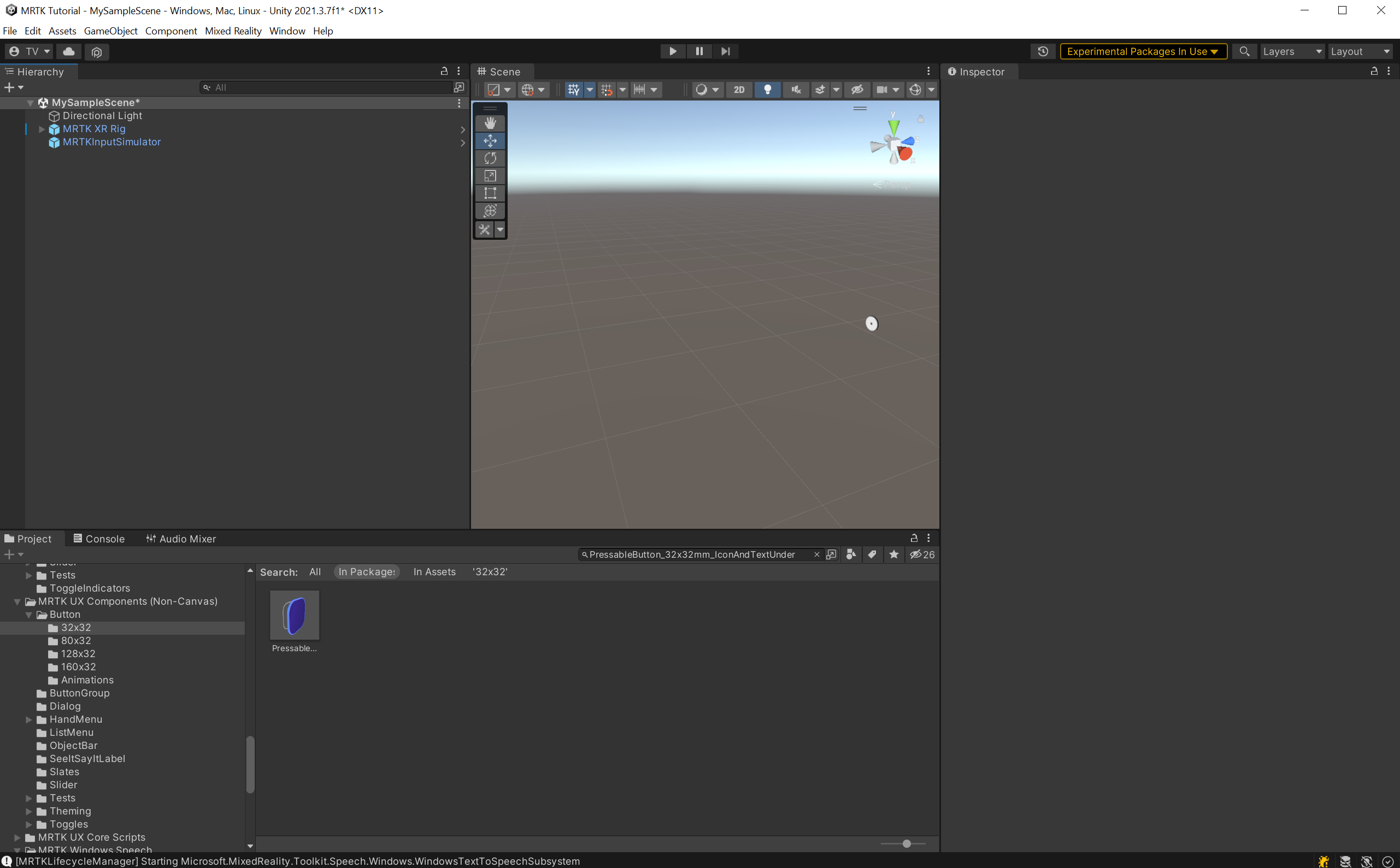 O botão prefab é a entrada representada por um ícone azul. Clique e arraste o PressableButton_32x32mm_IconAndTextUnder pré-fabricado para a Hierarquia. Com o objeto PressableButton_32x32mm_IconAndTextUnder ainda selecionado, na janela Inspetor, configure o componente Transform da seguinte maneira: