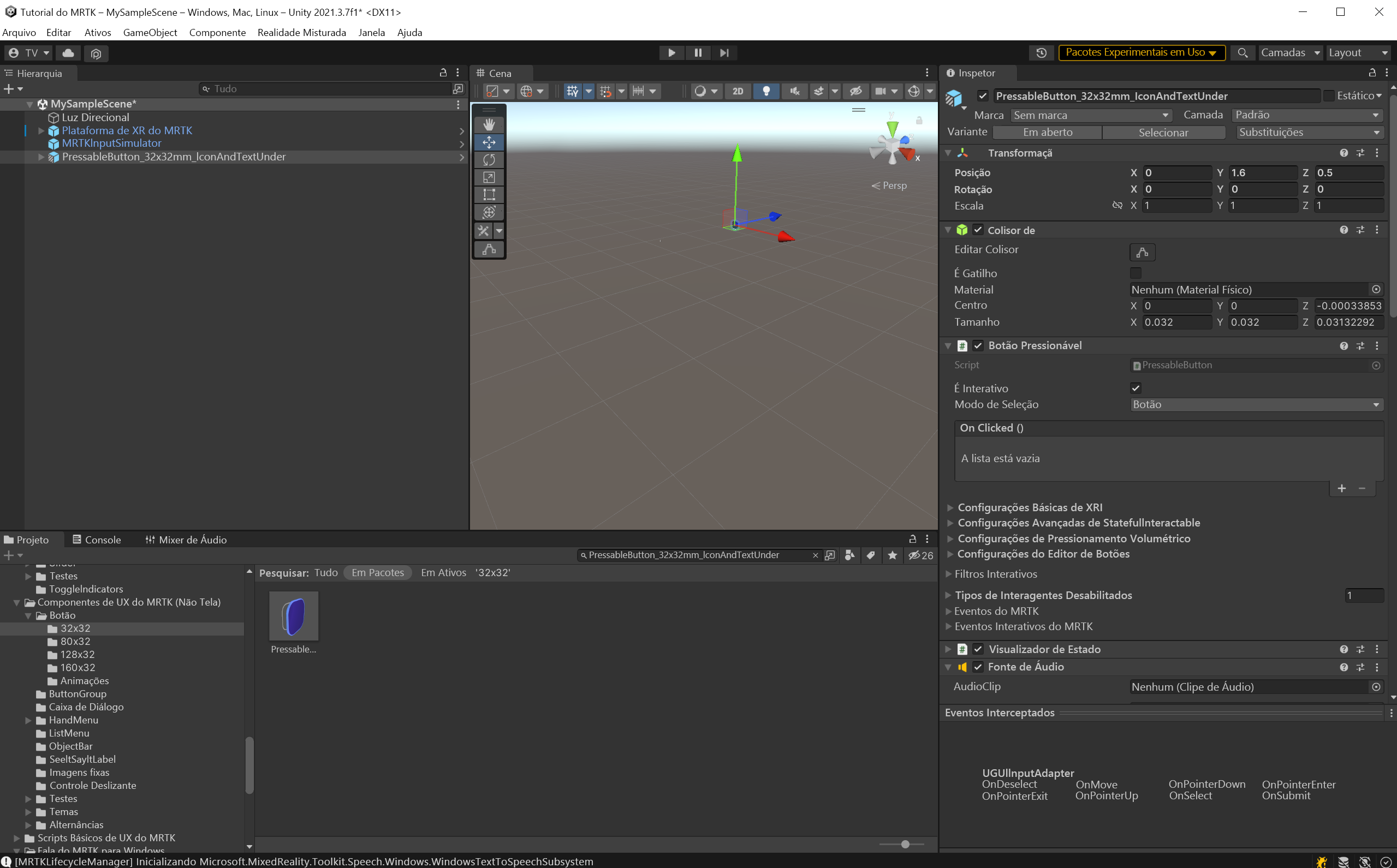 Para testar o áudio espacializado no editor Unity, você precisa adicionar um clipe de áudio no componente fonte de áudio com opção Loop marcada em PressableButton_32x32mm_IconAndTextUnder objeto.